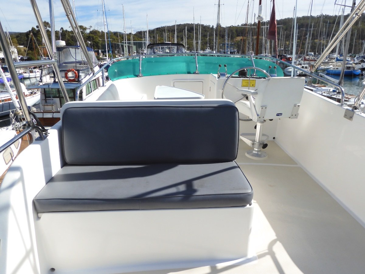 The well protected cockpit is a great place to relax, with the NEW covers providing excellent protection from the elements. There is just a few easy steps up to the large flybridge. This features a dinette, and ample seating for at least 6 people, making it an excellent space to enjoy the sunshine with the skipper! This area is protected by a bimini, and features the NEW Solar Panels. The wide walk around decks provide easy access forward in all conditions. The bow is fitted with two anchors and rollers, the primary having 65m of chain, ideal for Tasmanian conditions.